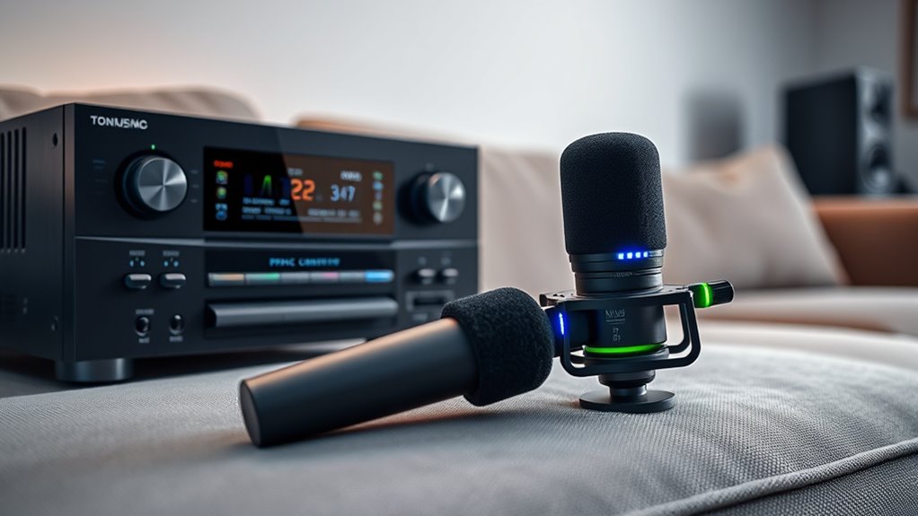 Room correction systems substantially enhance your sound quality by optimizing speaker calibration, ensuring each speaker’s output aligns perfectly with your room’s acoustics. They automatically adjust for issues like reflections and standing waves, reducing the need for extensive acoustic treatment. This results in clearer dialogue, richer bass, and more balanced sound, making your listening experience more immersive without manual adjustments.