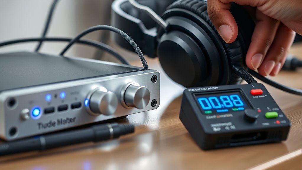 To calibrate your headphone amplifier for personal listening, start by setting the gain to a moderate level and playing familiar tracks at a comfortable volume. Adjust the gain up or down to eliminate distortion and guarantee clear, balanced sound. Match the impedance by consulting your headphones’ specs and using the amp controls. Monitor levels with indicators to prevent overload. Continuing further helps you fine-tune your setup for the best, personalized audio experience.