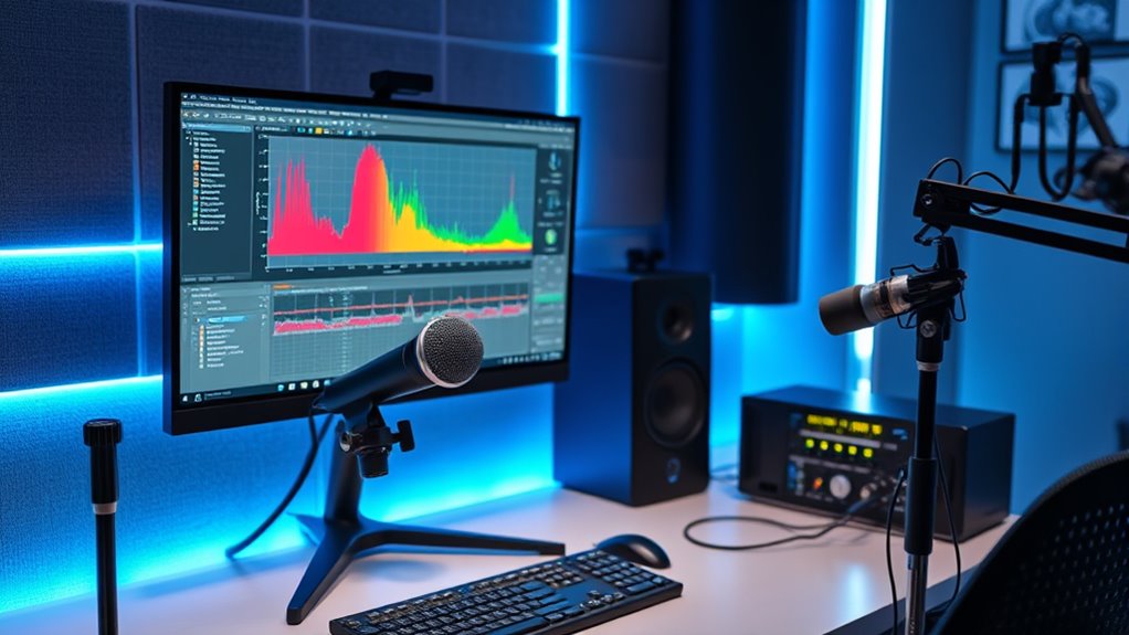 Analyzing frequency response and room modes is essential for identifying how your room influences your sound. Accurate measurements reveal peaks and dips caused by room resonance and subwoofer placement, helping you understand problematic areas. Proper microphone positioning is vital; place the mic at your listening position to capture an accurate response. When analyzing the data, look for consistent dips or peaks across frequencies, indicating room modes. These resonances can cause bass booms or nulls, skewing your perception of sound. By identifying these issues, you can plan effective treatments or adjust subwoofer placement to minimize their impact. Remember, understanding the room’s influence through detailed frequency analysis is the foundation for creating a balanced, professional listening environment.