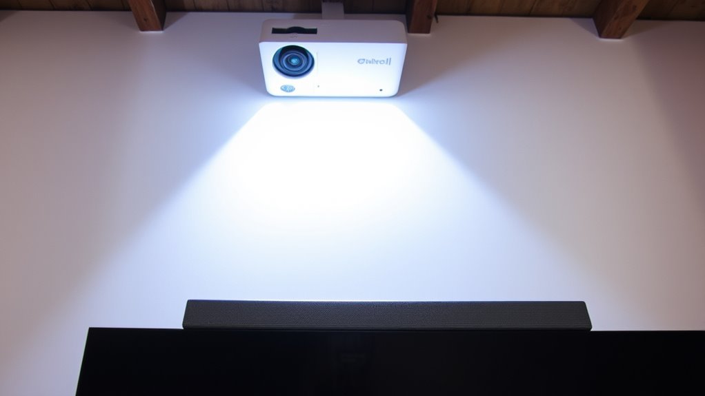 You should place your soundbar directly below or above your projector screen for ideal acoustic placement. Make certain the soundbar isn’t blocked by furniture or objects, which can affect room acoustics. Positioning it at ear level when seated enhances sound clarity. Experiment with slight angles to improve sound distribution, and consider room acoustics—adding rugs or curtains can reduce echo and improve overall audio quality.