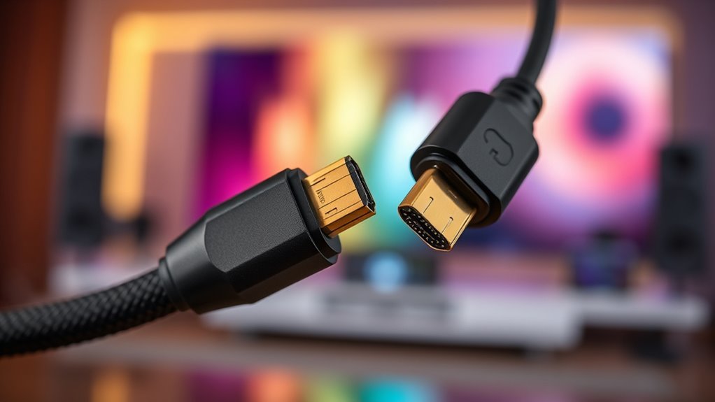 Even with the right cable in hand, guaranteeing a secure connection is vital for peak performance. If your HDMI 2.1 cable isn’t properly secured, signal quality can suffer, leading to flickering or loss of picture. Check that the cable is fully inserted into both the source device and display. Avoid loose connections by listening for a click or ensuring the connector seats firmly. Cable tension matters too; pulling or tugging on the cable can loosen the connection over time, causing intermittent issues. Make sure the cable is snug without excessive force. Proper securement prevents accidental disconnections and maintains consistent signal quality. Taking a moment to double-check your connections ensures maximum performance and avoids frustrating troubleshooting later.