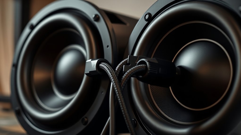Impedance matching is another vital aspect of connecting multiple subwoofers. Your amplifier or receiver has a specific impedance rating, and matching your subwoofers’ impedance ensures you don’t overload or underutilize your equipment. Check the subwoofers’ impedance ratings, typically listed as ohms, and confirm they match your amplifier’s recommended load. If you’re wiring two subwoofers, wiring them in parallel can reduce the overall impedance, which might strain your amplifier if it’s not rated for lower impedance loads. Conversely, wiring them in series increases impedance, offering a safer load but potentially reducing overall volume. Proper impedance matching prevents damage to your gear and guarantees ideal power transfer, resulting in clearer, more controlled bass.