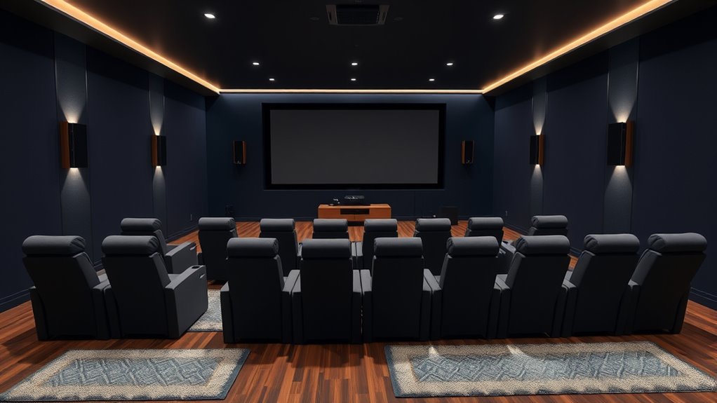 Next, pay close attention to seating arrangements. Comfort and viewing angles are critical for an enjoyable experience. You should position seats so every viewer has a clear, unobstructed view of the screen. Think about the room’s layout—arranging seats in a slight curve often provides optimal sightlines. Consider tiered seating if space allows; it elevates the back row, ensuring everyone has a good view. The type of seating matters too. Recliners or plush sofas can add to the cinematic feel and keep everyone comfortable for hours. Keep in mind, the distance from the screen influences the size and number of seats. You want to avoid seats that are too close, which can cause eye strain, or too far, which diminishes immersion. Once you settle on a layout, test it out by sitting in each spot and adjusting until everyone has a perfect view and comfortable angle. Additionally, soundproofing techniques can enhance the overall experience by maintaining audio clarity and preventing sound leakage.
