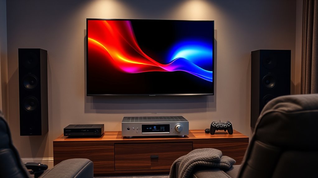 To establish an effective home theater system, you’ll need key components like high-quality speakers, a reliable display, and a compatible receiver. Proper calibration and room setup help optimize sound clarity and reduce echoes, while your seating arrangement ensures everyone gets the best view and sound experience. When these elements work together, you’ll enjoy immersive audio and stunning visuals. Keep exploring to discover how each part contributes to creating your perfect home theater environment.