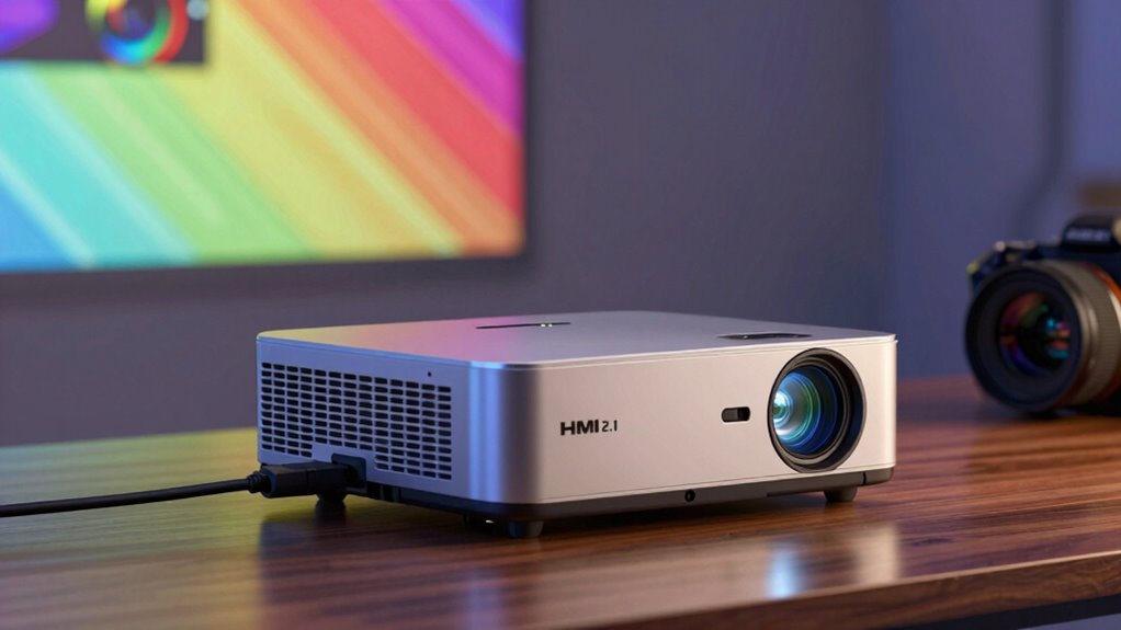Projector setup becomes more straightforward with HDMI 2.1, reducing cable installation complications and setup complexity. You’ll find it easier to connect high-resolution devices, thanks to improved features like higher bandwidth. While it might seem intimidating initially, HDMI 2.1 simplifies compatibility and future-proofing, making your installation smoother. Embrace the benefits of advanced connectivity, and enjoy a seamless, stunning viewing experience without the hassle of tangled cables or confusing configurations.
