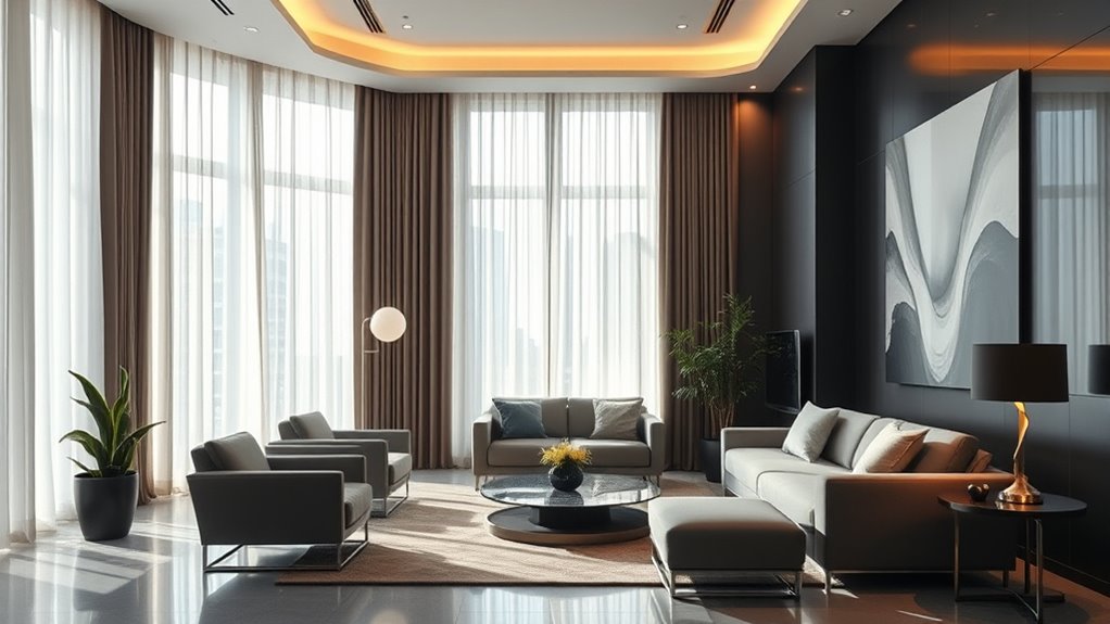 In interior design, ambient light rejection helps you create comfortable, glare-free spaces by controlling natural light sources. Using window treatments like blackout shades, roller blinds, or layered curtains allows you to adjust light levels and reduce harsh brightness that can cause eye strain or make screens hard to see. Properly managing ambient light improves visual clarity and energy efficiency, helping your space feel balanced and inviting. Keep exploring to discover more effective strategies for optimizing your environment.