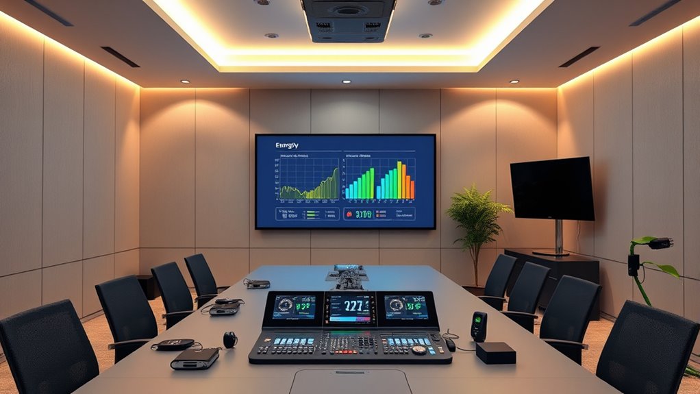 You should regularly perform energy audits and use consumption tracking tools to monitor your AV systems. These practices help identify areas where energy is squandered and enable you to optimize usage. Implement real-time monitoring solutions that provide instant data, so you can make informed adjustments. Consistently reviewing your energy data allows you to improve efficiency, reduce costs, and guarantee your AV systems operate sustainably and effectively over time.