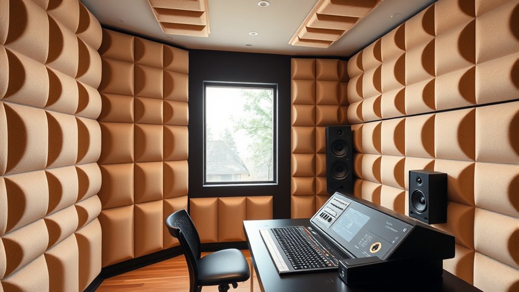 Beyond soundproofing, room shape optimization plays a critical role in achieving clear, balanced audio. The shape and dimensions of your space influence how sound waves behave inside it. Rectangular rooms, for instance, often cause standing waves and flutter echoes, which can muddy the sound. To counter this, you might consider adjusting the room’s shape by adding built-in or movable acoustic diffusers and absorbers. These elements help break up standing waves and distribute sound more evenly. When designing or modifying your space, aim for non-parallel walls or asymmetrical layouts to minimize acoustic anomalies. Even small tweaks, like angling walls or incorporating irregular surfaces, can markedly improve sound clarity. Incorporating sound absorption techniques can further enhance the room’s acoustics by reducing unwanted reflections and reverberation. Strategically placing acoustic panels and bass traps is another essential aspect. Position panels at reflection points—such as the wall behind your speakers or your listening position—to absorb sound before it bounces around the room. Bass traps placed in corners help control low-frequency resonances that can muddy audio. While these treatments are important, they work best when combined with soundproofing techniques and thoughtful room shape optimization.