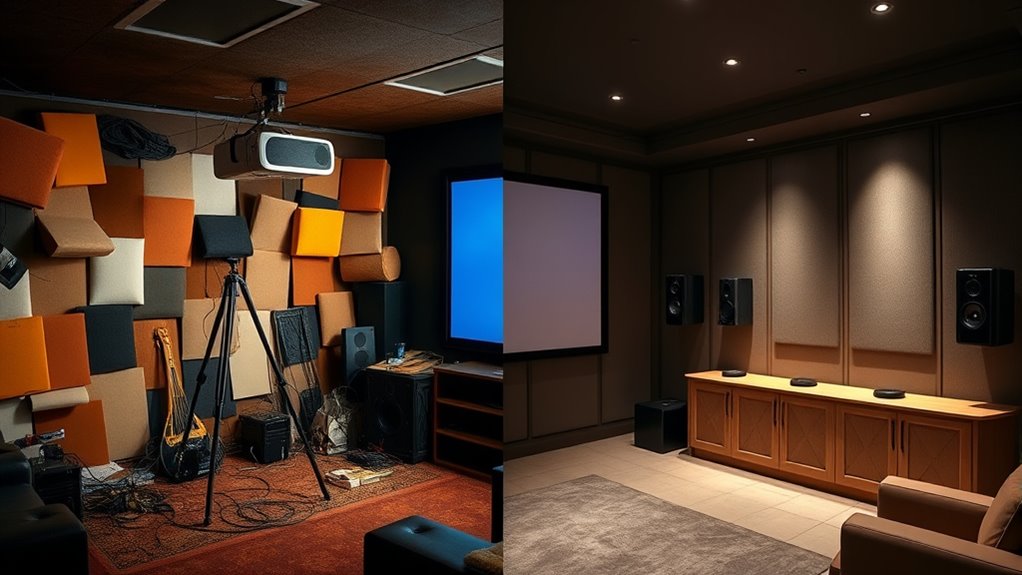 Choosing between a DIY home theater build and professional installation depends on your priorities. If you want full control, cost savings, and enjoy hands-on projects, DIY can be rewarding, but it requires significant time, effort, and technical skills to get calibration and soundproofing right. On the other hand, professionals offer expert calibration and soundproofing, ensuring top-quality results quickly. To discover which approach suits your needs best, keep exploring the pros and cons.