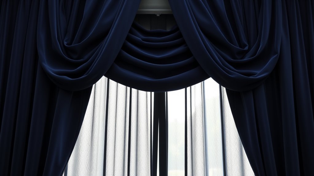 To select drapes and blackout curtains for ideal viewing, consider fabric textures and hardware that match your room’s style and needs. Heavier fabrics like velvet or satin block light and sound better, while lighter fabrics create a softer ambiance. Opt for sturdy rods for heavy blackout curtains, and choose a style that complements your decor. If you want to improve your setup, keep exploring how the right choices can enhance your viewing experience.
