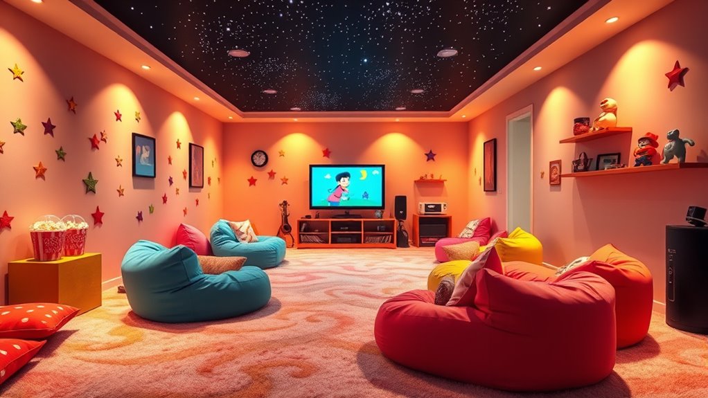 To create a kid-friendly home cinema, choose colorful decor, playful murals, and comfy, flexible seating like bean bags and plush armchairs for a cozy vibe. Make safety a priority by covering outlets, securing cords, and avoiding sharp edges. Designate a snack area with child-proof containers away from screens. Use durable, washable materials to handle spills and active use. Keep the space engaging and inviting—continue exploring how to turn your cinema into an exciting, safe haven for kids.