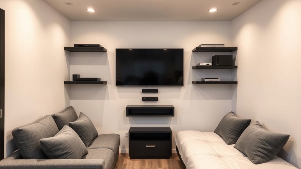 Think of your space as a canvas, and your furniture as the brushstrokes that define your home theater. Multi-functional furniture, like storage ottomans and sofa beds, blends comfort with practicality, while wall-mounted racks free up floor space for movement. These options maximize your available area, allowing you to enjoy a cinematic experience without clutter. Embrace versatile pieces to create a sleek, spacious setup that feels expansive and inviting.