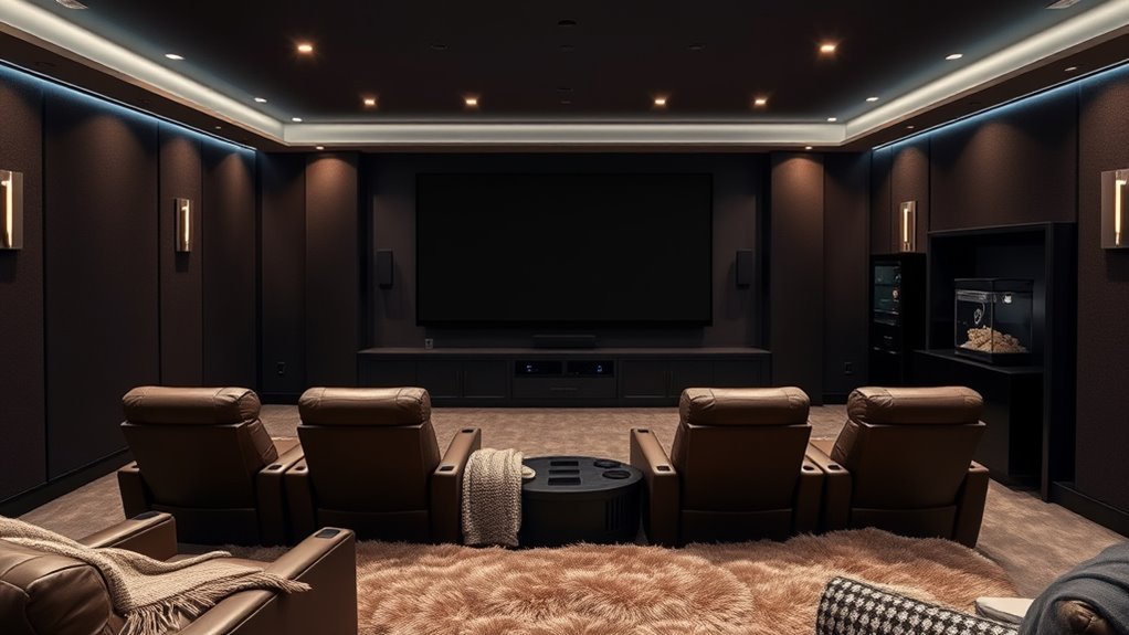 You can soundproof your home theater effectively by adding acoustic treatments like bass traps and foam panels to absorb sound and reduce echoes. Install soundproof doors with tight seals to prevent noise leakage. Consider sealing gaps around windows and vents, and use heavy curtains or double-glazed windows for extra soundproofing. These steps help create a quiet, immersive environment, letting you enjoy movies without disturbing others.