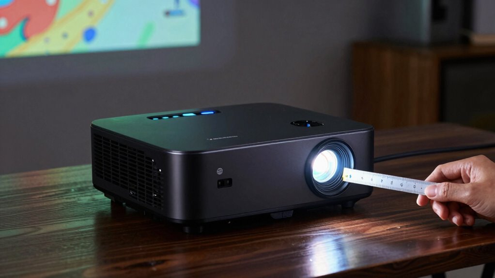 For home theaters, aim for an ANSI lumen range of 1500 to 2500, depending on ambient light considerations. You should calibrate your projector to optimize image quality and brightness, especially if your room has some ambient light. Keep in mind, lower lumens can work in dark rooms, but brighter settings are necessary if you can’t control light sources. Proper calibration guarantees you get the best viewing experience.