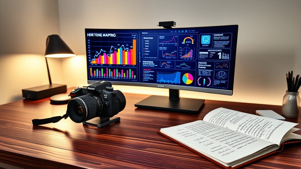Tone mapping is a essential process that compresses the wide range of luminance levels in high dynamic range (HDR) images into a displayable format, making details visible without losing the scene’s natural feel. To achieve this, you can use various techniques like global and local tone mapping. Local contrast enhancement is key, as it emphasizes details in darker and brighter areas, creating a more dynamic and realistic image. Color grading also plays a fundamental role, allowing you to fine-tune hues and saturation to match the scene’s mood. Best practices involve balancing contrast and preserving natural colors, avoiding over- or under-processing. Additionally, understanding the dynamic range of your display device helps optimize the tone mapping process for better visual results. Considering the capabilities of different displays ensures your HDR images are tailored for optimal viewing experience. It is also important to consider the color accuracy of your output to ensure that the final image maintains true-to-life hues and saturation. By understanding these techniques, you guarantee your HDR images are visually striking, true to life, and comfortable to view across different displays.