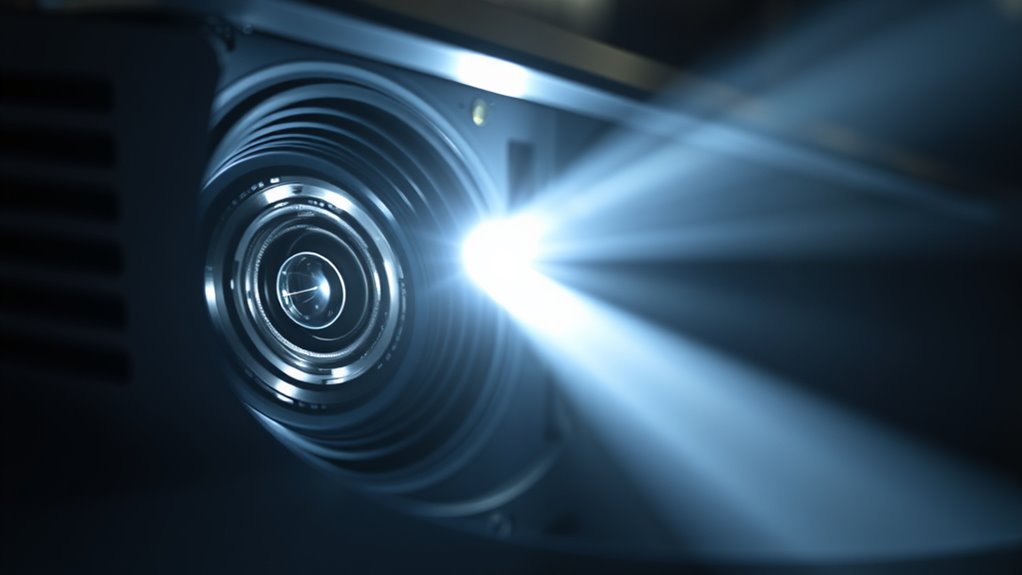 You’ll notice that advancements in projector lens technology focus on improved lens coatings and smarter aperture design. Modern lens coatings reduce glare and increase contrast, making images clearer even in bright environments. Meanwhile, innovative aperture designs allow for better control of light, enhancing depth of field and focus accuracy. These improvements help you enjoy sharper, more vibrant images with minimal distortion, regardless of ambient lighting conditions.