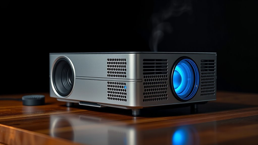 When choosing a projector, don’t overlook noise levels and cooling systems—they can make or break your viewing experience. While some models run quietly and efficiently, others might turn your space into a noisy chaos. Remember, the devil is in the details, so do your homework to find a unit that balances performance with peace and quiet. After all, it’s better to have a projector that’s as silent as a whisper rather than one that’s all bark and no bite.