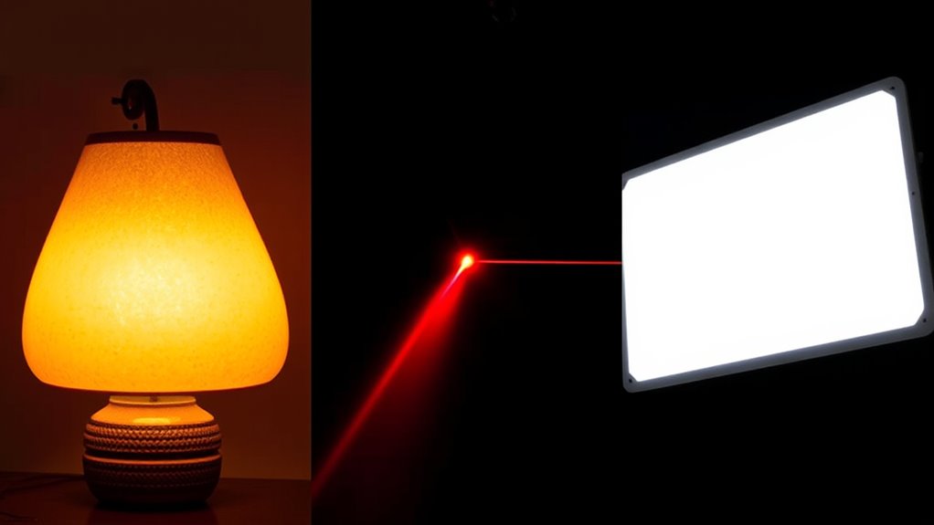 You need to take into account how environmental conditions impact each light source’s performance. Humidity can cause lenses or components to fog or corrode, especially in lamps and LEDs. Temperature instability affects laser precision and longevity, reducing efficiency or causing damage. To guarantee ideal function, keep devices in stable environments, control humidity levels, and avoid extreme temperatures. Proper care helps maintain brightness, consistency, and lifespan across all types of lighting.