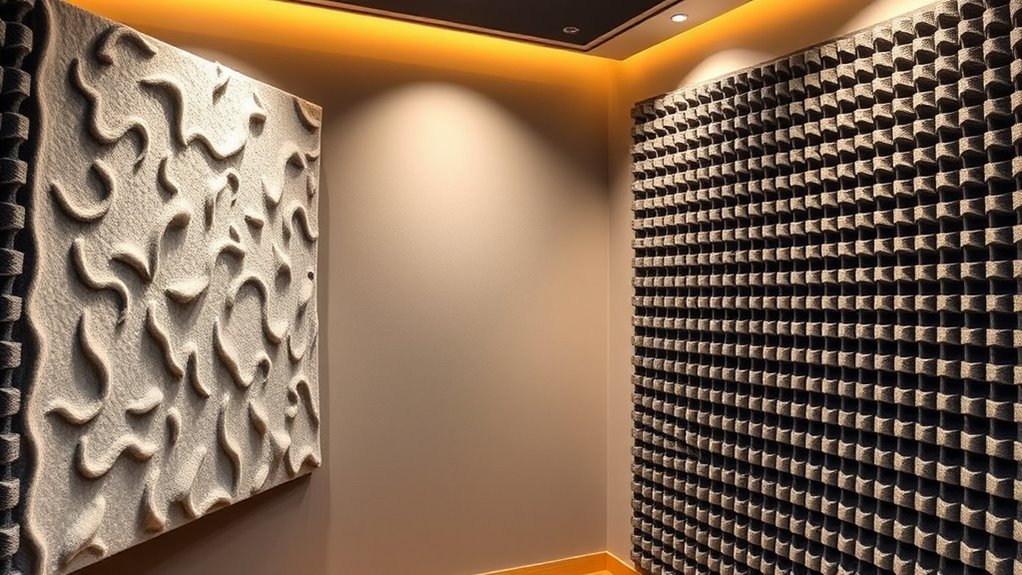 You should choose materials based on their acoustic properties and suitability for your needs. For diffusers, materials like wood, plastic, or foam with irregular surfaces work best, as they scatter sound effectively. Absorbers benefit from porous materials such as mineral wool, fiberglass, or foam panels that absorb sound waves. Selecting the right materials guarantees peak sound quality, whether you want to diffuse or absorb sound in your space.