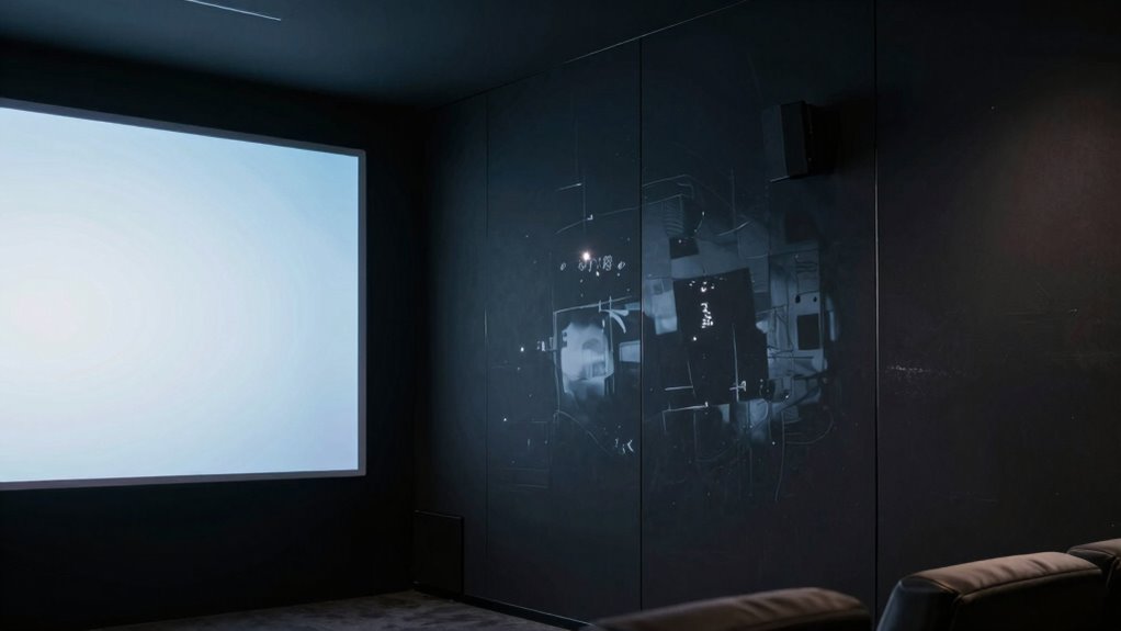 Minimizing side wall reflections is a manageable task that can considerably enhance your viewing experience. One simple approach is adding decorative wall panels, which not only improve acoustics but also enhance aesthetics. You can also experiment with acoustic foam placement by positioning foam panels at key reflection points along your side walls. For example, consider the following options: