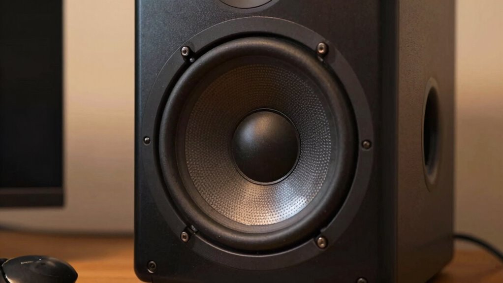 Imagine your room’s acoustics as a canvas, and speaker positioning as the brushstrokes shaping sound. Acoustic treatments can help smooth out bass response and reduce reflections, but they can’t fully compensate for subwoofer size limitations. Proper speaker placement and room acoustics work together to enhance bass clarity, making your small space feel larger and more balanced without needing a bigger subwoofer.