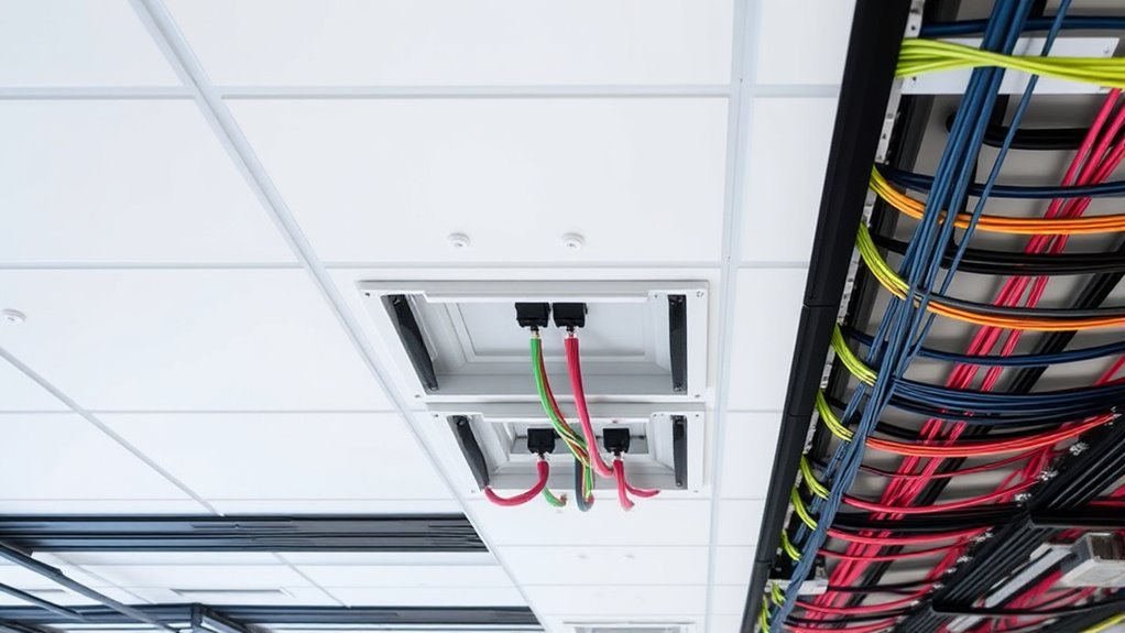 Planning your cable layout is essential for a clean and efficient ceiling setup. Start by mapping where your devices will be located and identify the best routes for cables. Consider wireless alternatives for areas where running wires might be be cumbersome or unsightly, reducing clutter and simplifying maintenance. Think about aesthetic considerations too — neat, hidden pathways keep your ceiling looking tidy and professional. Determine cable lengths needed, avoiding excess slack that can cause tangling or sagging. Prioritize direct routes to minimize cable runs and interference. Label your cables early to streamline future adjustments or troubleshooting. A well-thought-out plan ensures your ceiling remains functional, organized, and visually appealing, saving time during installation and maintenance while reducing the risk of messy wiring mess. Additionally, understanding essential oil safety can help avoid hazards during installation or maintenance work. Incorporating mindfulness techniques can also help you stay focused and attentive to detail throughout the process. Considering cable management tools can further enhance organization and make future upgrades easier. Implementing fraud detection techniques can further prevent unauthorized access or tampering with your wiring setup, ensuring ongoing security. Being aware of cable management best practices can optimize your setup for both safety and efficiency.