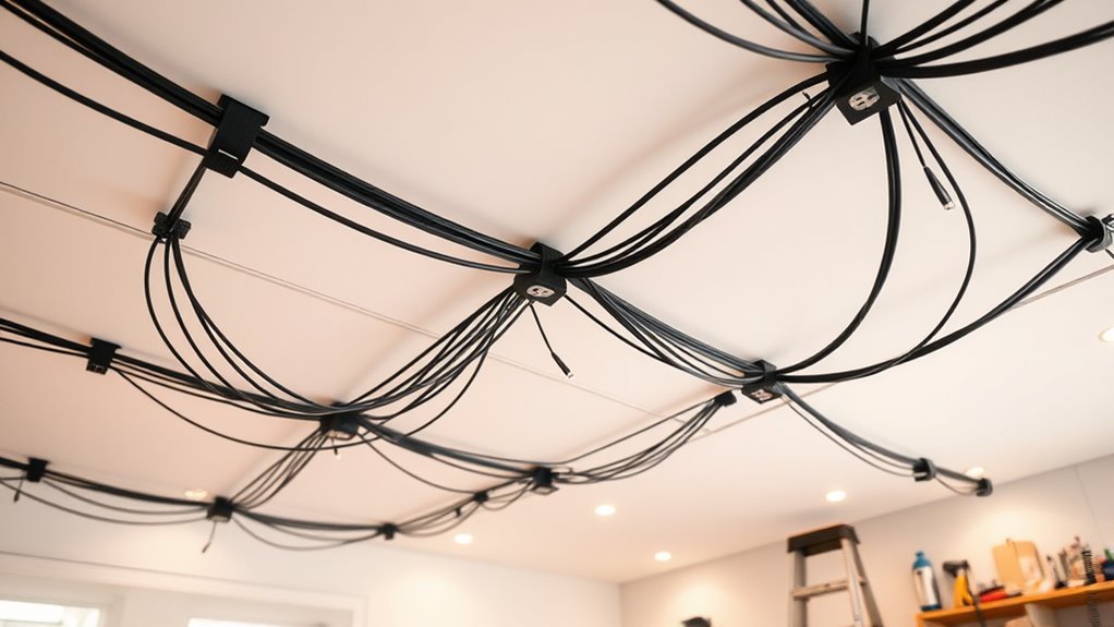 You’ll need essential tools like cable clips and wire organizers to keep your ceiling cables neat. Cable clips secure the wires along beams or ceilings, preventing sagging, while wire organizers help bundle multiple cables together for a tidy look. A cordless drill, scissors, and a measuring tape are also handy for precise placement and cutting. With these tools, you can quickly and effectively manage your ceiling cables for a clean, professional finish.