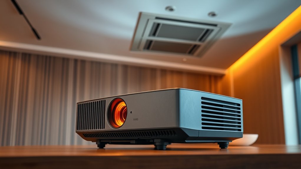 Proper placement of your projector directly influences its airflow and cooling efficiency. To optimize ventilation, position it in a well-ventilated area away from heat sources and obstructions. Consider the ventilation aesthetics—how your setup looks—so that cooling solutions blend seamlessly with your space. For a DIY ventilation approach, create custom airflow pathways using simple fans or vents to improve heat dissipation. Ascertain that air can circulate freely around the projector, preventing hot spots and overheating. Avoid clutter that blocks vents or restricts airflow. Regularly clean dust from filters and vents to maintain efficiency. Ensuring proper air circulation is essential for optimal performance and longevity. Additionally, choosing appropriate ventilation systems and understanding their role can significantly enhance your projector’s cooling effectiveness. Thoughtful placement and a clean, functional environment help your projector stay cool, perform reliably, and extend its lifespan.