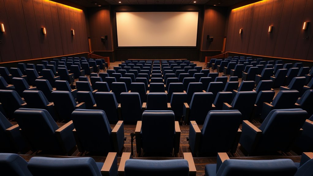 Lighting design plays a vital role in shaping your seating arrangements for ideal viewing. When you plan your space, consider how lighting impacts sightline optimization—avoid glare or shadows that could hinder your view. Position seats where lighting complements the sightline, ensuring that ambient or task lighting enhances visibility without causing distractions. Proper lighting and thoughtful seating layout work together to create an environment where everyone enjoys clear, unobstructed views.