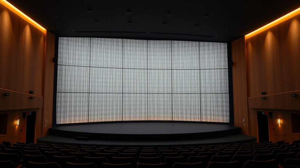Acoustically transparent screens are specially designed panels that let sound pass through with minimal distortion, making them ideal for spaces where clear audio is essential, like home theaters and conference rooms. Crafted from high-quality fabrics or meshes, these screens absorb sound effectively while offering a sleek, unobtrusive look that blends seamlessly into your environment. Durability ensures they withstand regular use without deterioration. Keep exploring to discover more about how these innovative screens can enhance your audio-visual setup.