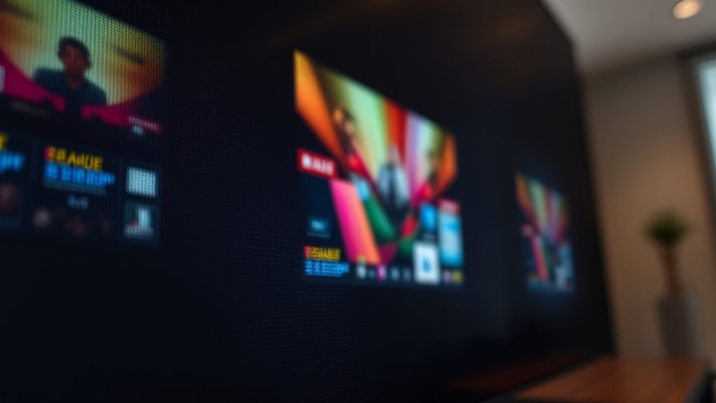 Ambient Light Rejecting (ALR) screens are designed to block or reflect ambient light away from your viewing area, making your projected images appear brighter, sharper, and more vibrant even in well-lit rooms. They use special surface finishes, optical coatings, and microstructures to reduce glare and reflections, improving contrast and color accuracy. This means you can enjoy high-quality visuals without dimming the lights. Keep exploring to discover how these screens can transform your viewing experience in any environment.