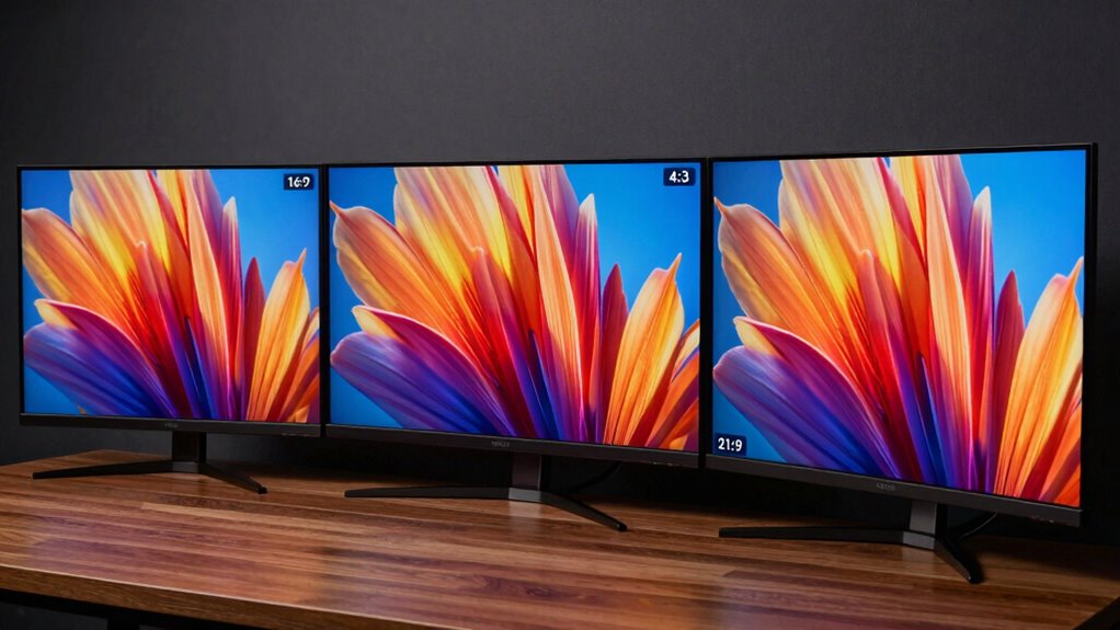 The most common screen aspect ratios are 16:9, 4:3, and 21:9, each serving different viewing needs and device types. Understanding this standard ratios overview helps you choose the right display for your needs. The aspect ratio history reveals how display technology evolved from the 4:3 format of early TVs to the widescreen 16:9, now dominant in TVs and monitors. The 16:9 ratio balances cinematic experience and productivity. The 4:3, once standard for older displays and monitors, is now less common but still used in some specialized applications. The 21:9 ratio, popular in high-end monitors and cinematic screens, offers an immersive experience. Keeping these standard ratios in mind ensures you select a screen that aligns with your viewing habits and device compatibility. Additionally, understanding aspect ratio evolution can help you make more informed decisions about your display options.