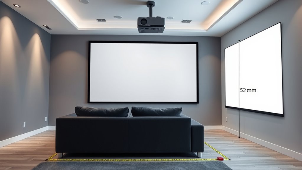 Room depth plays a significant role in your projection setup. Measure your space carefully before selecting a projector. If the distance from where you’ll mount or place the projector to the wall or screen exceeds the projector’s throw capabilities, your image will either be too small or require repositioning. Proper understanding of room depth helps you optimize projection calibration, ensuring the image fills the screen appropriately without cropping or stretching, which can degrade quality. Additionally, considering projection calibration and accessories like lens shift and keystone correction can help fine-tune your setup for irregular room shapes or placement constraints.