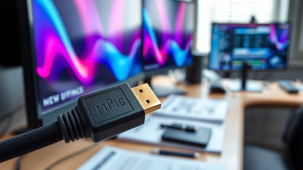 Environmental factors like electromagnetic interference and physical obstructions can disrupt your HDMI handshake stability. Electromagnetic interference from devices like microwaves or wireless routers creates noise that hampers signal recognition. Physical obstructions, such as walls or furniture, weaken the signal strength between your devices. To improve stability, keep cables away from interference sources and ensure a clear line of sight. Proper cable placement and shielding can markedly reduce handshake issues caused by environmental factors.