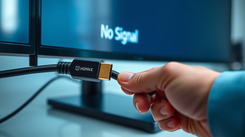 To resolve HDMI no signal errors, start by checking your cables and connections for visible damage or loose ends. Make certain you’re using a certified HDMI cable and try reconnecting both ends securely. Switch to different HDMI ports and verify your display is set to the correct input. Adjust the device resolution if needed, making sure it matches your display’s capabilities. If issues persist, updating your device and display firmware often helps. Keep exploring for more tips to fix the problem effectively.