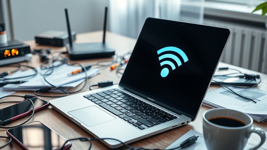 Proper placement of your router profoundly influences Wi-Fi stability. Placing your router in a central, elevated position enhances signal strength, reducing dropouts. Avoid hiding it behind furniture or near metal objects that can block signals. Clear, unobstructed router positioning minimizes interference, ensuring a stronger, steadier connection. Remember, strategic router positioning promotes superior signal strength, which directly stabilizes your Wi-Fi, helping you stay seamlessly connected.