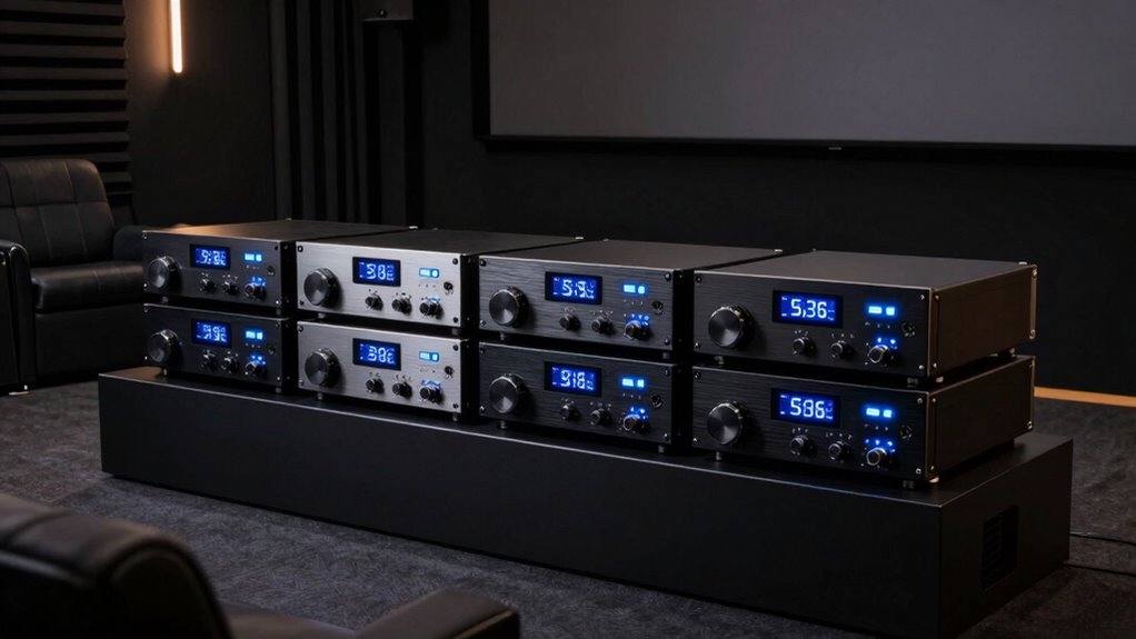 Choosing the right 2-channel amplifier for your front speakers can truly transform your theater experience. Think of it as the heartbeat of your sound system, pulsing with clarity and power. When selecting, consider power output, connectivity, and versatility. Remember, the perfect amp isn’t just about volume; it’s about bringing your movies and music to life. So, pick wisely—because the right amplifier is the key to a front-row feeling, right in your own home.