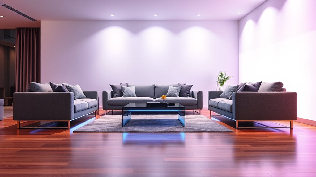 Did you know that walls with a matte, neutral color can boost 4K image quality by up to 30%? I recommend using a flat, matte white or light gray wall for ideal projection. These surfaces prevent glare and reflections, ensuring sharp, vibrant images. Avoid glossy or textured walls, as they can distort the picture. I’ve found that a smooth, light-colored wall makes a huge difference in your viewing experience.