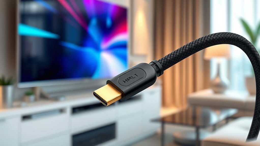When choosing an 8K HDMI 2.1 cable, I focus on compatibility with my devices, ensuring it supports the latest standards. I also pay attention to bandwidth and build quality to guarantee smooth performance and durability. Ultimately, I consider the cable’s length, flexibility, and certification to make sure it meets my setup needs reliably.