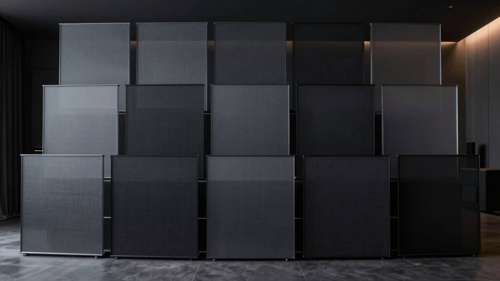The quality of acoustically transparent screen material hinges on its weave density and fabric composition, both of which directly impact sound transmission and image clarity. A tight, multi-layer weave design helps prevent moiré effects and minimizes visual distortion, ensuring sharp image resolution. The fabric’s composition also influences its durability and color accuracy, especially when certified by standards like ISF or flame-retardant requirements. The gain rating, typically around 1.0 to 1.15, affects brightness and contrast, playing a vital role in overall image quality. Additionally, perforation size and pattern must strike a balance—allowing sound to pass through without compromising optical properties or image fidelity. These factors collectively determine how well the screen performs both visually and acoustically.