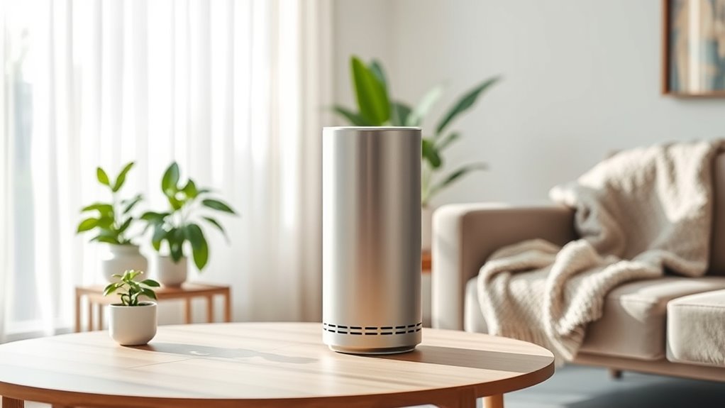Since a quiet environment is essential for allergy sufferers, paying attention to an air purifier’s noise levels is crucial. Most models operate below 30dB, which is as quiet as a whisper, making them ideal for bedrooms or living spaces. Many units feature sleep modes or quiet settings that reduce noise to 20-25dB, ensuring undisturbed rest. Be cautious with higher fan speeds or turbo modes, as they can produce sounds over 50dB, potentially disrupting sleep or concentration. Some air purifiers include noise-dampening features like sound-absorbing materials or specially engineered motors to keep operation quieter. When choosing, look for models explicitly rated for quiet operation to maintain a peaceful environment and avoid unnecessary disruption during allergy relief.
