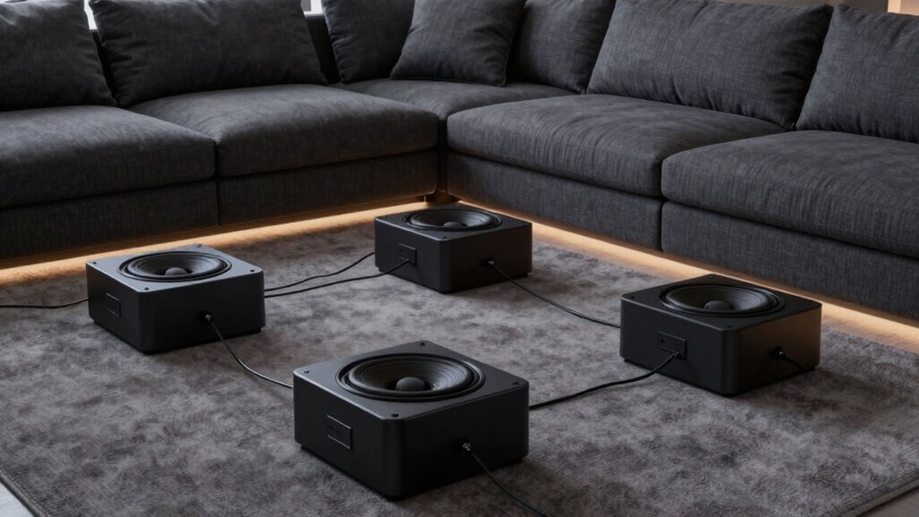 Adjusting vibration intensity is key to customizing your couch experience. It lets you match tactile feedback to your personal comfort level or the scene’s demands. Many bass shaker kits come with built-in low pass filters or adjustable gain controls, giving you precise control over vibration strength. This flexibility helps prevent overstimulation or discomfort, especially during long movie nights. Proper vibration control also boosts immersion by syncing tactile feedback with audio cues and scene dynamics, making the experience more realistic. Being able to regulate vibration intensity ensures everyone can enjoy the setup at their preferred level, whether subtle or intense. Overall, this feature is essential for tailoring your home theater environment, so look for kits that offer easy and accurate vibration adjustment options.