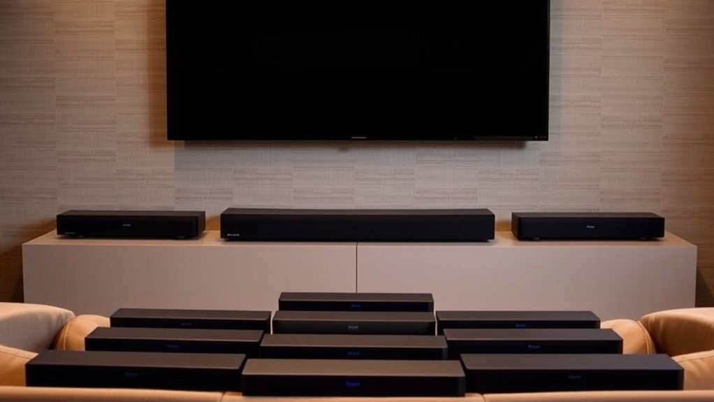 Choosing the right surround sound features for your BenQ soundbar can considerably enhance your audio experience. Features like Dolby Atmos, DTS:X, or MultiBeam create immersive soundscapes by simulating multi-directional audio, making you feel like you’re in the middle of the action. Multiple channels, including upward-firing or height speakers, add depth and dimension, heightening realism. Wireless surround capabilities, such as rear speakers or bipole surrounds, offer flexible placement without messy wiring, improving the true surround experience. Additionally, dedicated center channels sharpen dialogue clarity, ensuring conversations stand out clearly. Advanced surround sound processing technologies automatically adjust the sound field to match your room’s acoustics, optimizing performance. These features work together to deliver a richer, more immersive audio experience tailored to your space.