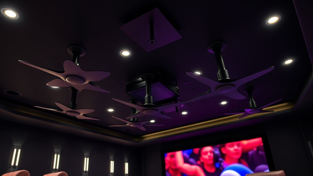 Looking for the best ceiling mounts for your dedicated home theater in 2025? I recommend options like adjustable projector mounts with extendable arms, versatile TV mounts supporting large screens, and universal brackets for various devices. Durability and flexibility are key, so I focus on mounts made from steel or aluminum that offer tilt, swivel, and height adjustments. Want to find out which models fit your space perfectly? Keep going to discover more details.