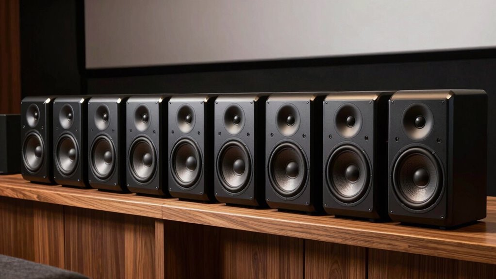 Achieving clear dialogue is essential for an effective center channel speaker, as it guarantees speech remains understandable without causing listener fatigue. Speakers with dedicated high-frequency drivers, like silk dome tweeters, often produce more natural and crisp vocals. Proper tonal matching with other speakers in your system helps maintain dialogue clarity and guarantees seamless sound integration. The quality of midrange frequency handling directly impacts how intelligible voices sound in movies and TV shows. Features such as optimized crossover design and horn-loaded tweeters can also improve directivity, focusing sound onto the listener for better clarity. When choosing a center channel under $500, look for these elements to ensure your system delivers sharp, clear dialogue that enhances your overall listening experience.