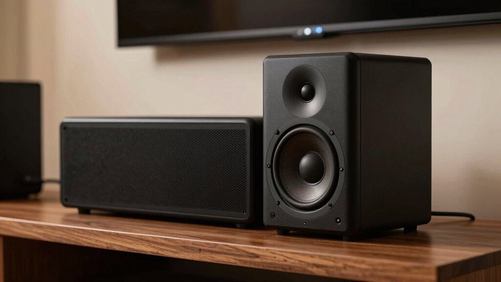Achieving clear sound in a center channel speaker depends mainly on using high-quality drivers and a precise crossover design. Silk dome tweeters, combined with well-placed woofers, help deliver vocal clarity while reducing distortion at various volume levels. Proper dispersion patterns, like 90° x 90° Tractrix horns, guarantee even sound coverage and make dialogue more intelligible across the listening area. Accurate frequency response, especially in the midrange (around 1-4 kHz), is essential for natural, lifelike speech. Additionally, minimizing port noise and cabinet vibrations keeps audio clean during dynamic scenes. These factors work together to produce crisp, clear sound, making your home theater experience more immersive and guaranteeing dialogue remains intelligible, even at lower or higher volumes.