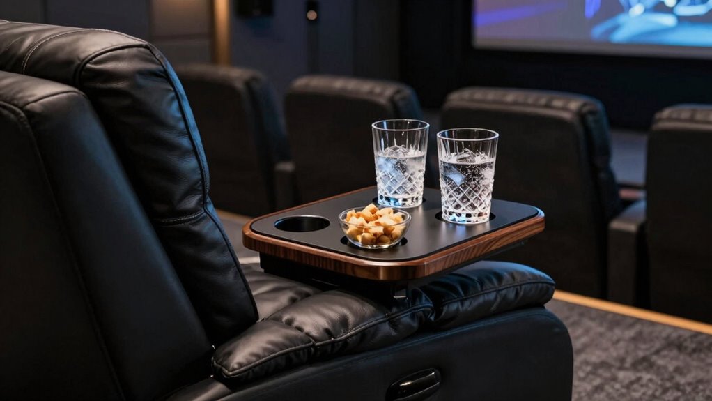 When selecting a premium cup holder tray for a theater recliner, I consider compatibility with my furniture to guarantee a snug fit. I also look at material durability and ease of cleaning because these trays see plenty of use. Finally, I prioritize spill resistance and multi-functionality to enhance convenience and safety.