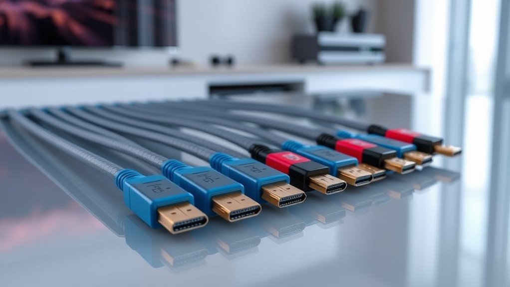 A fiber optic HDMI 2.1 cable typically lasts around 10 to 15 years, depending on usage and handling. I’ve found that they’re quite durable, especially since they resist electromagnetic interference and don’t degrade like copper cables. To guarantee a long lifespan, I recommend avoiding excessive bending, keeping them away from heat, and storing them properly when not in use. Proper care can really extend their performance.
