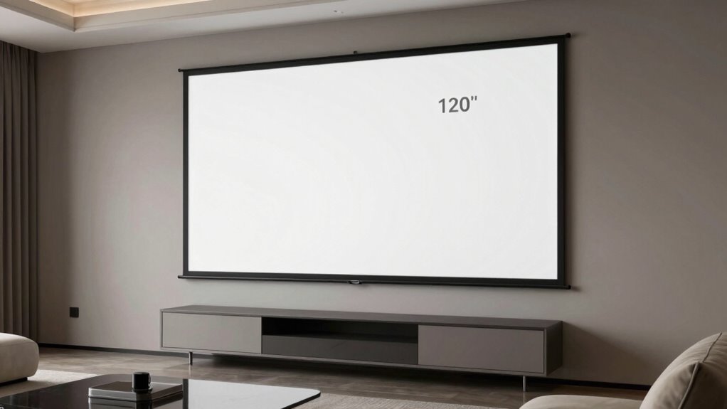 Selecting the right screen material is essential for achieving a clear, vibrant image on your 120-inch fixed frame projector screen. High-quality materials like PVC or specialized coatings guarantee vivid color reproduction and sharp contrast. Matte white surfaces with a gain of 1.1 to 1.3 strike a balance between brightness and wide viewing angles, making the image visible from multiple seats. Black-backed surfaces help block light penetration, preserving contrast in brighter rooms. Durable, wrinkle-free materials such as PVC or elasticized fabrics keep the screen flat and free of distortions. Additionally, surfaces designed with high light absorption and textured finishes enhance sharpness and reduce light bleed, assuring your images stay crisp, even in challenging lighting conditions.