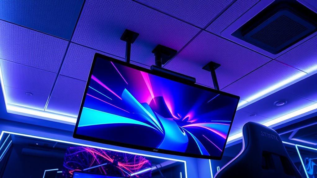 Choosing the perfect gaming ceiling mount can truly transform your setup into a cinematic fortress—it’s like having a personal command center right above your head. With so many options, you’ll find one that fits your space and style perfectly. Remember, the right mount isn’t just functional; it’s the backbone of an epic gaming experience. So go ahead, elevate your game—your ultimate setup awaits, and it’s more impressive than a spaceship docking station!